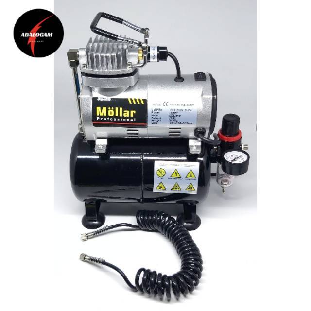 MOLLAR Mini Compressor Set Air Brush merupakan perangkat untuk pengecatan Air Brush. Cocok bagi anda yang ingin belajar menggambar dengan Air Brush untuk segala macam kebutuhan.Dapat pula digunakan untuk Spay Gun, Isi Angin Kendaraan dan Stapler Tembak.Kelengkapan : Mini Compressor Only- Daya Listrik 150 Watt- Motor 1/5 HP- Pressure 25-30 Psi- Voltase 110 / 220 V AC- Horse Power 0.2 HP- Kecepatan Mesin 1450 rpm- Air Tank 3 Liter- 310 x 135 x 310 mm- Nipple Out 1/8" (Setelah Filter) / 1/4" (Sebelum Filter)- Kapasitas Aliran Udara 23 liter /