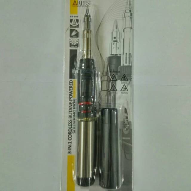 Solder Gas Aries ES-665Weight: 150g (no gas)Fuel: ButaneGas container capacity: 22mlOperating time: 125 minutesSize (L x W x 0) 245 x 30 x 25 mmApproximate Temperature: 250-400C (soldering iron)Up to 5///50C (heat gun)Up to 1300C (torch)Sangat nyaman digunakan dalam gengaman tanganPemantik otomatisMeet U.S child resistant standart (c