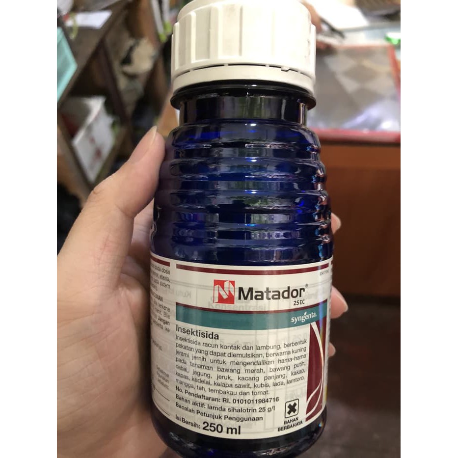Insektisida Matador 25EC Insektisida racun kontak dan lambung, berbentuk perkataan yang dapat di emulsikan, berwarna kuning jerami sirene untuk mengendalikan hama-hama pada tanaman bawang merah, bawang putih, jagung, jagung, jeruk, kacang panjang, kakao, cabai, kapas, kedelai, kelapa sawit, kubis, lada, lamtoro, mangga teh, tembakau dan tomat. Bahan Aktif : Lamda Sihalotrin 25g/lIsi Bersih : 250 ml.Untuk pengiriman luar pulau harap dikonfirmasi terlebih d