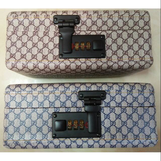 Tempat uang/kosmetik/perhiasanMerek : gucciMotif : gucci kecil waterproofWarna : coklat dan biruBahan : kulit sintetisBuatan : lokalBahan dalam : brudu (kulit balik warna merah) Uk : panjang 21cm x lebar 10cm x tinggi 8cmPakai kunci 3 digitCara mengganti nomer kunci:Posisi awal kunci 000Cara buka tekan ke arah luar dari posisi kunciCara ganti nomer : 'tekan ke arah dalam posisi kunci sambil ditahan geser angka yg diinginkan dan pastikan posisinya tepat ditengah kemudian lepaskan 'tekanan maka nomer kunci sudah berubah.Kalau lupa kunci : pelan2 dicari bisa tapi butuh seharian sampai 2 harianAtau bisa juga kirim kesini untuk dibongkar dan direset (ongkir ditanggung pembeli) waktu bongkar lbh kurang 3-5hari. Karena volume perhitungan lbh kurang 2pcs sekilo#tempatuang#tempatkosmetik#boxuang#boxperhiasan#tempatperhiasan#boxkecilkunci#boxkunci#tempatserb